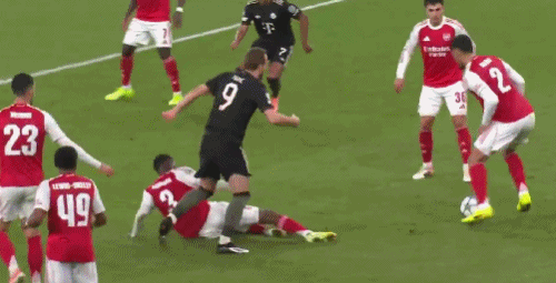 第45分鐘,薩利巴解圍打在自家人身上,差點(diǎn)被凱恩抓住機會(huì )
